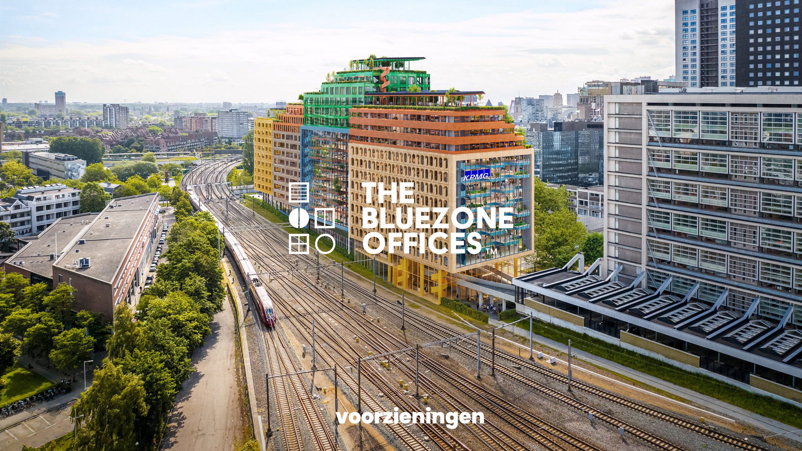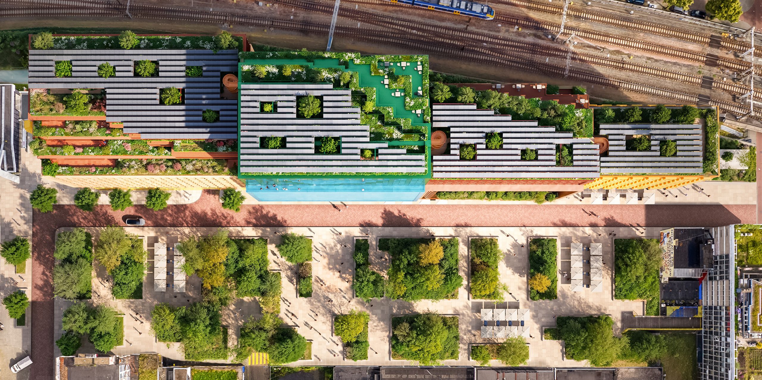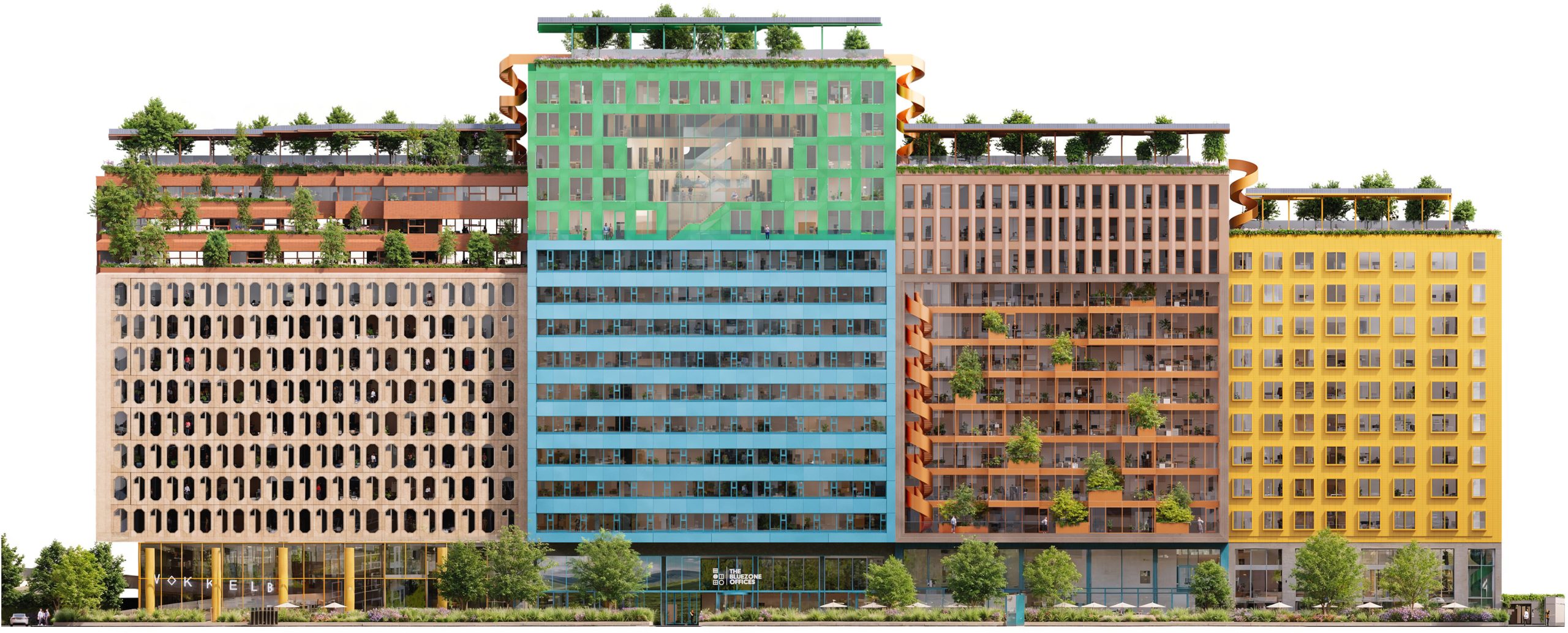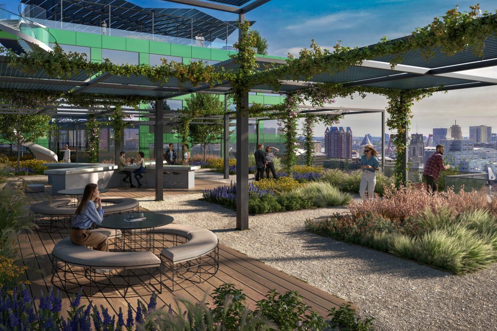 Blue Zone park is situated on the rooftops of the building, creating an intimate urban oasis in het heart of the city. The park invites the users and visitors to enjoy the outdoors to interact, have an informal meeting or simply enjoy a ray of sunlight. The rooftop garden further reduces heat, retains water and increases biodiversity. In essence the Blue Zone park is built around happiness, creating a perfect symbiosis between people and nature.