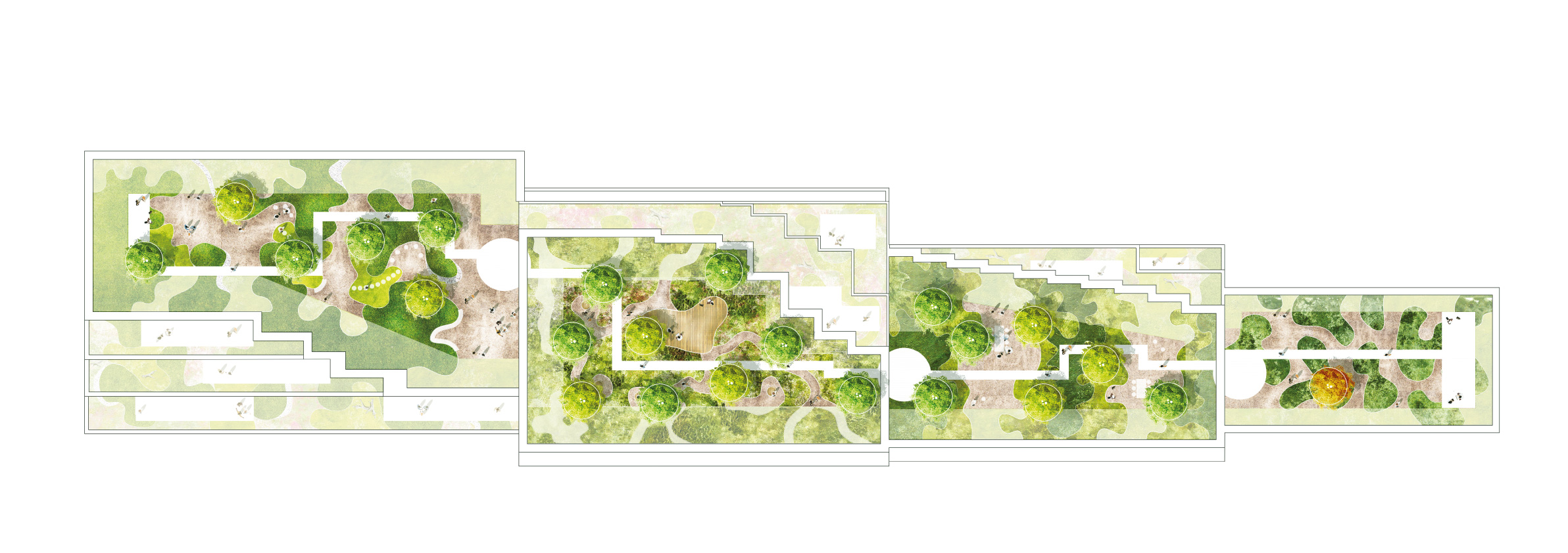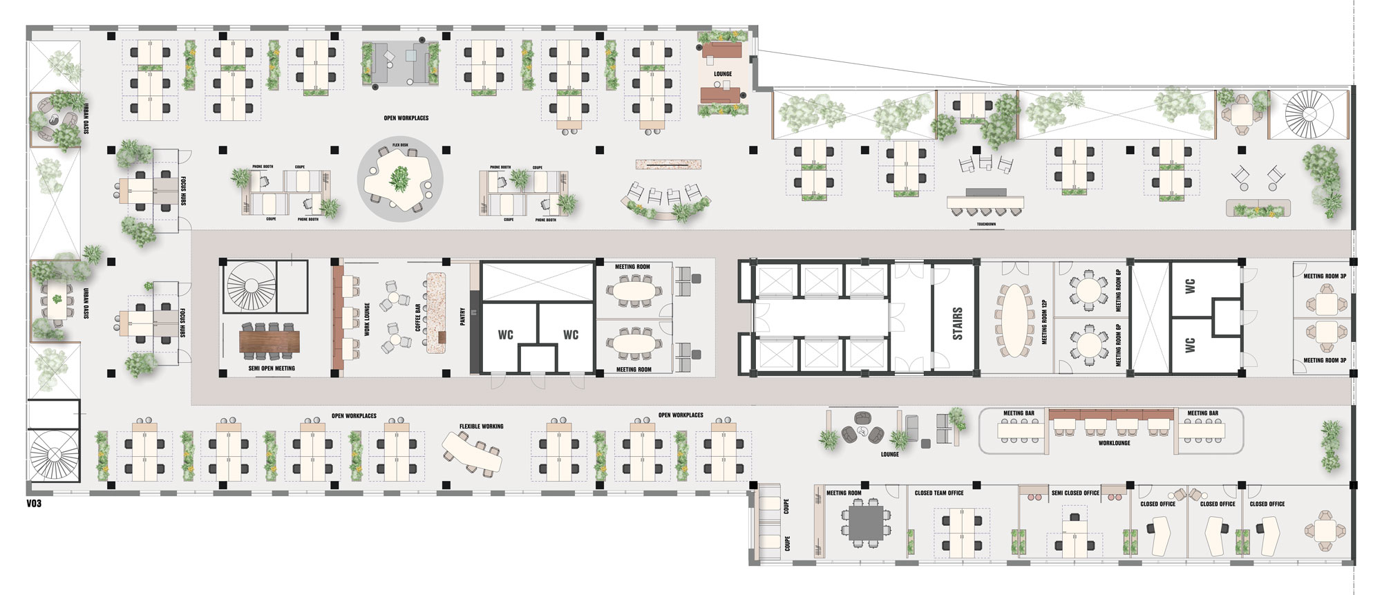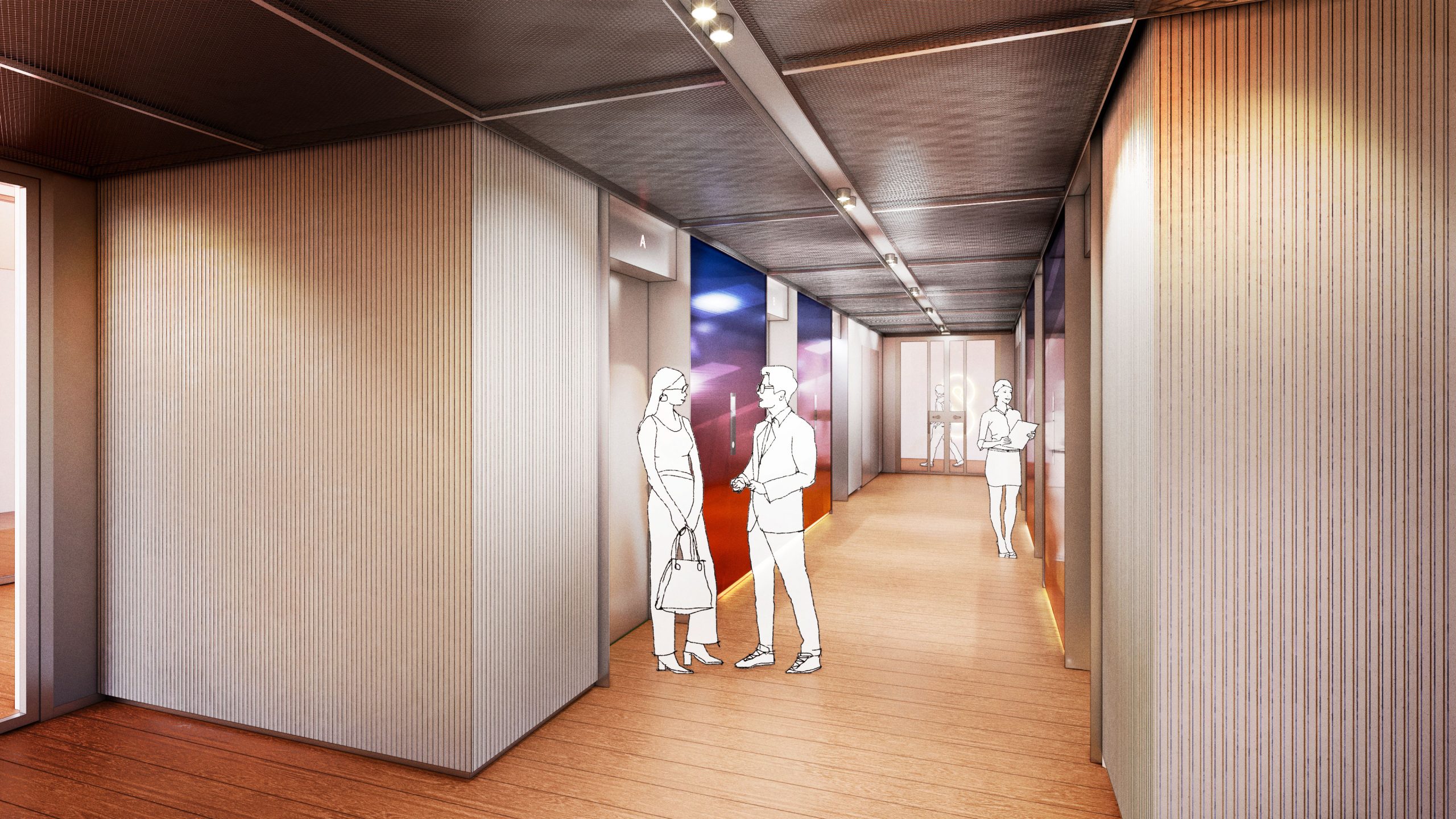 Blue Zone park is situated on the rooftops of the building, creating an intimate urban oasis in het heart of the city. The park invites the users and visitors to enjoy the outdoors to interact, have an informal meeting or simply enjoy a ray of sunlight. The rooftop garden further reduces heat, retains water and increases biodiversity. In essence the Blue Zone park is built around happiness, creating a perfect symbiosis between people and nature.