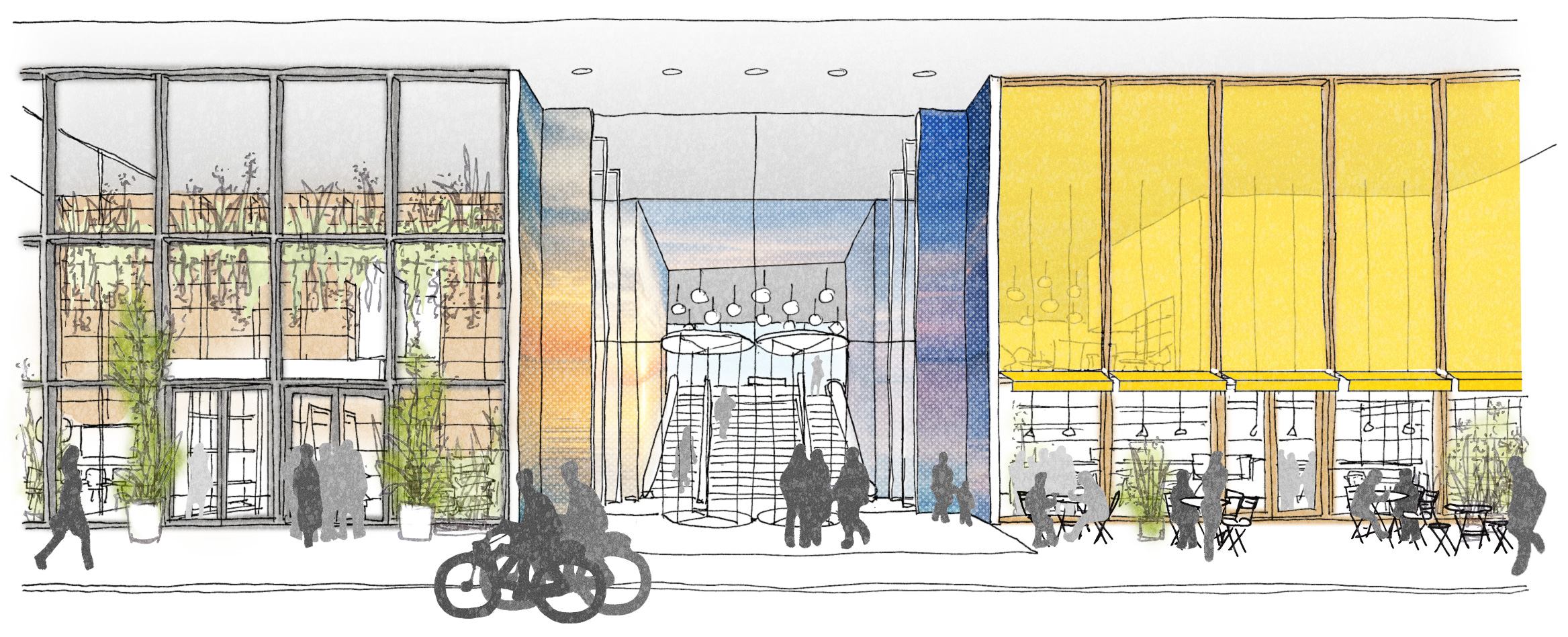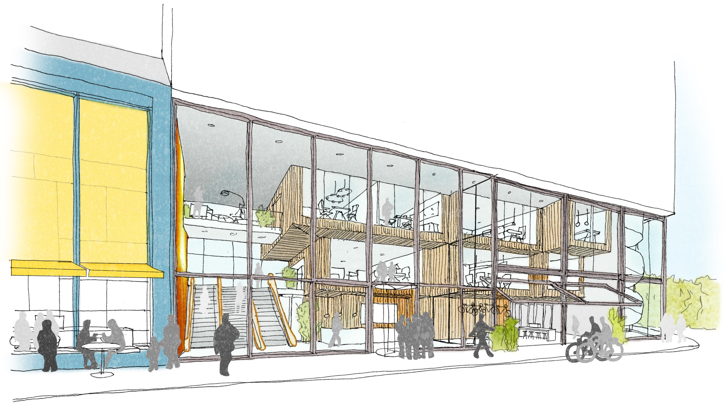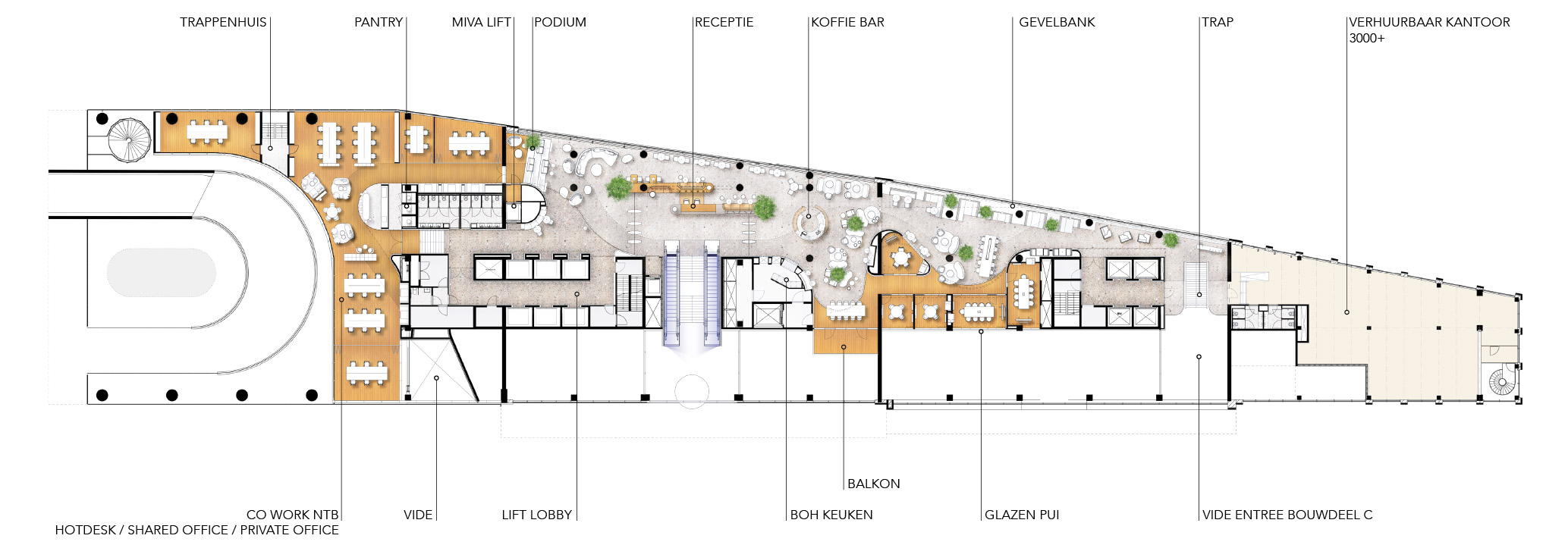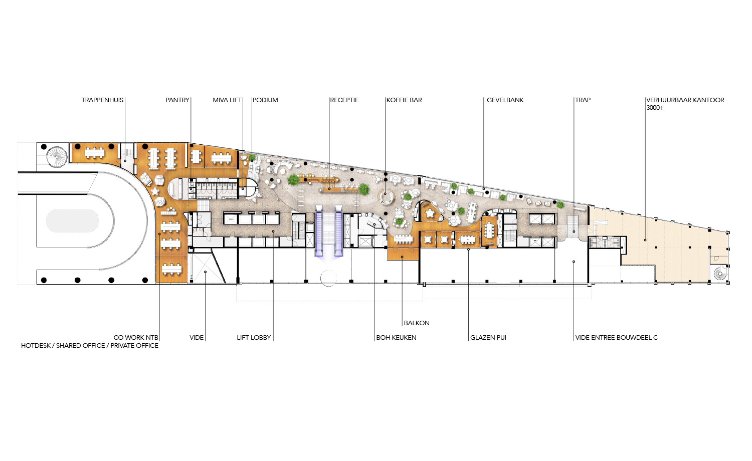 The beautiful, three-story atrium at the corner of the Schiekade will also serve as an entrance to the Blue Zone. From here, you can access the Work Café on the balcony floor via stairs and an escalator. This entrance could also become an exclusive access point for a major tenant within Blue Zone. Adjacent to this atrium is a Bike Café, connected to the bicycle parking in the basement.