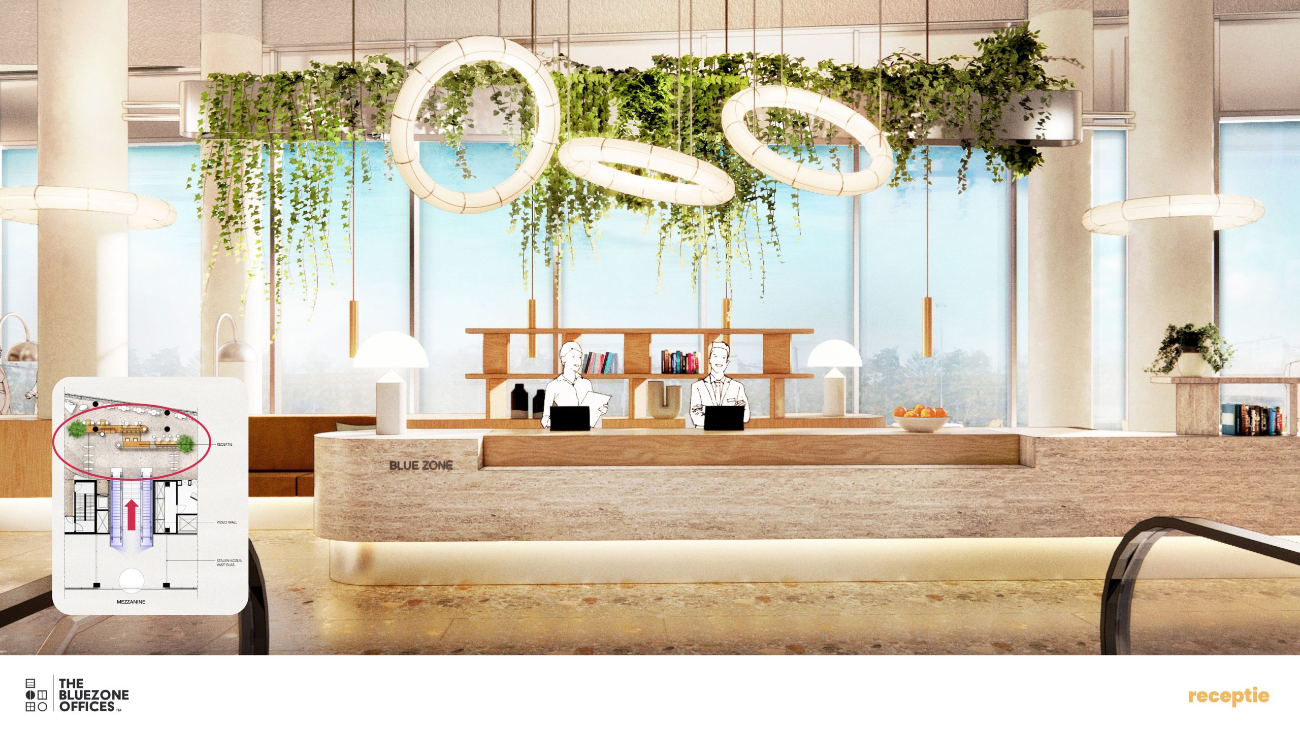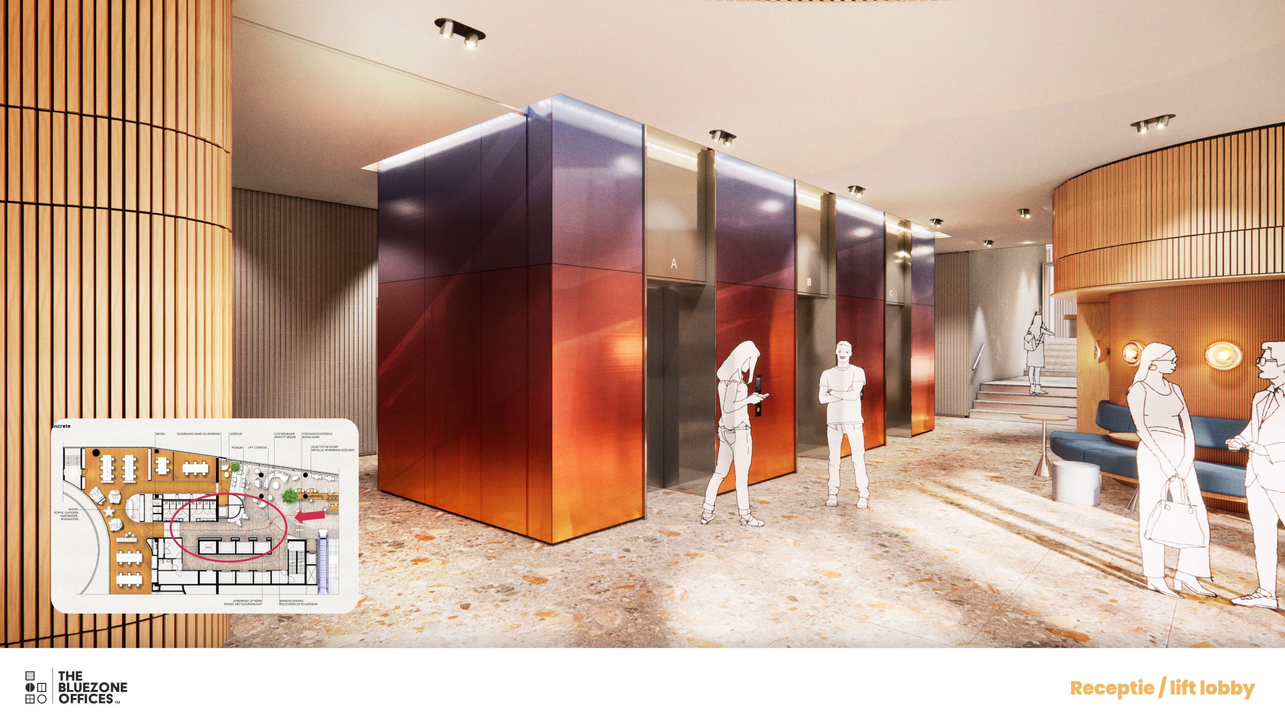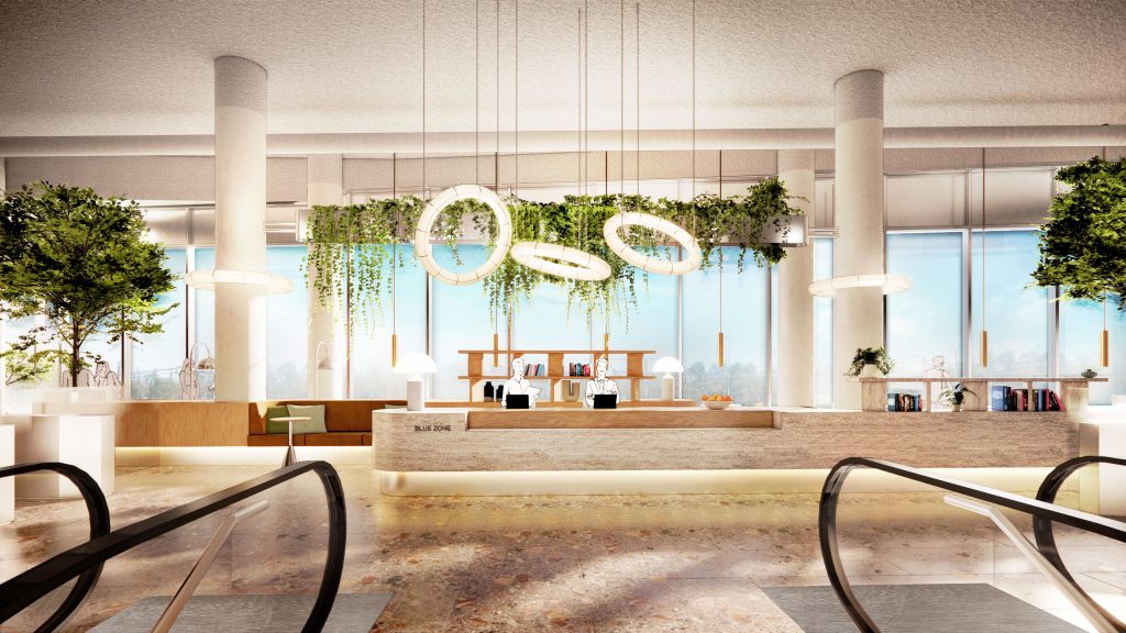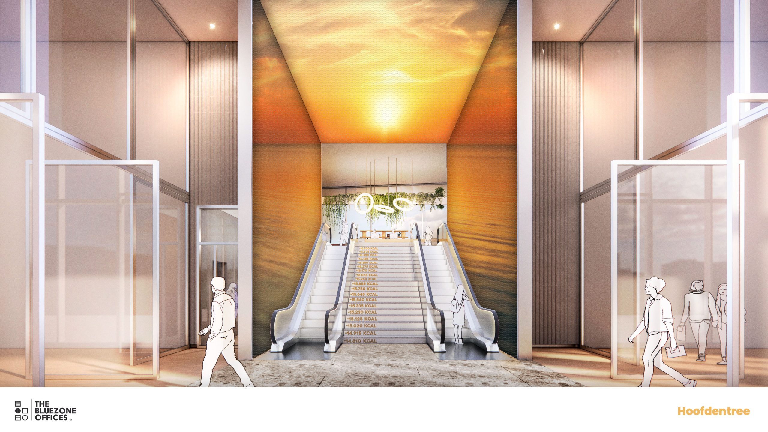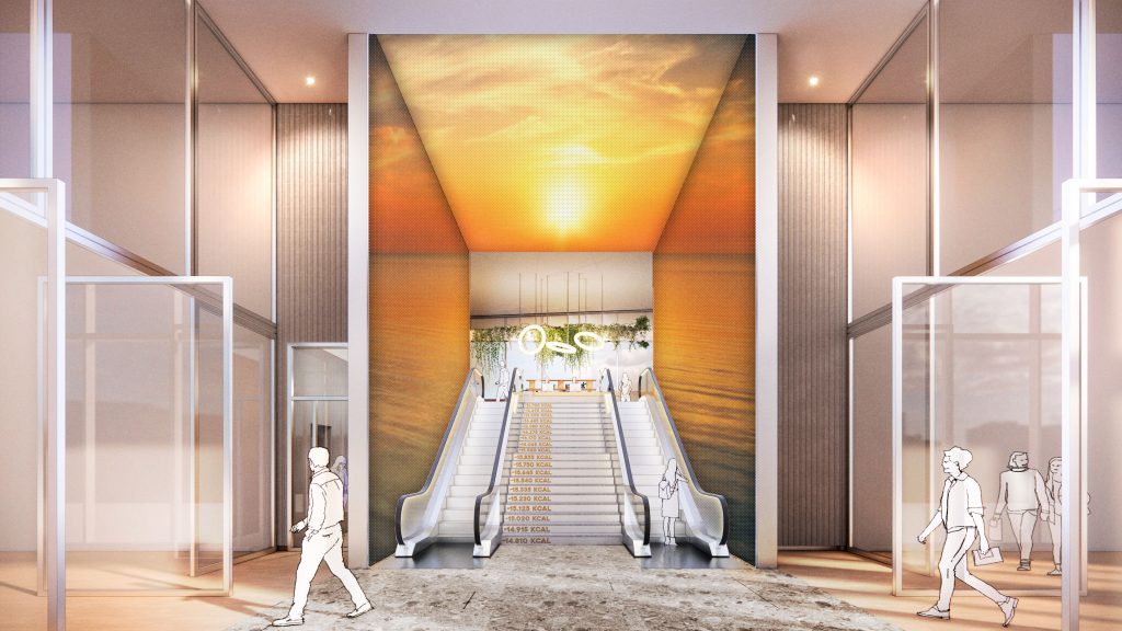At the heart of the building is the entrance to the Blue Zone offices. A prominently visible entrance leads you inside, followed by a spacious staircase with escalators taking you upwards to the reception and the Work Café. The staircase is surrounded by large multimedia screens that create a visual journey to the Blue Zone, an experience that takes your mind off things and welcomes you into this unique environment.
