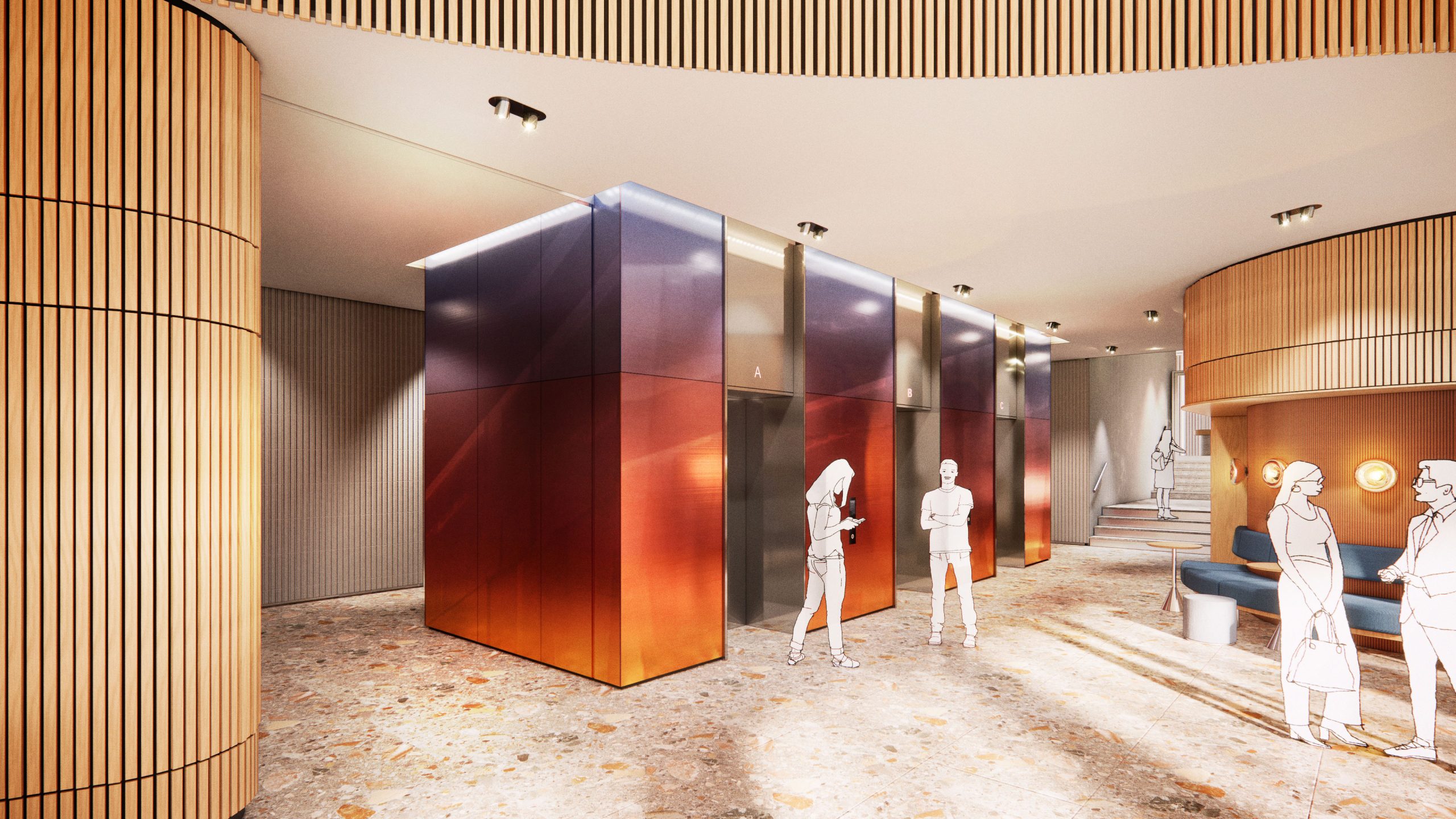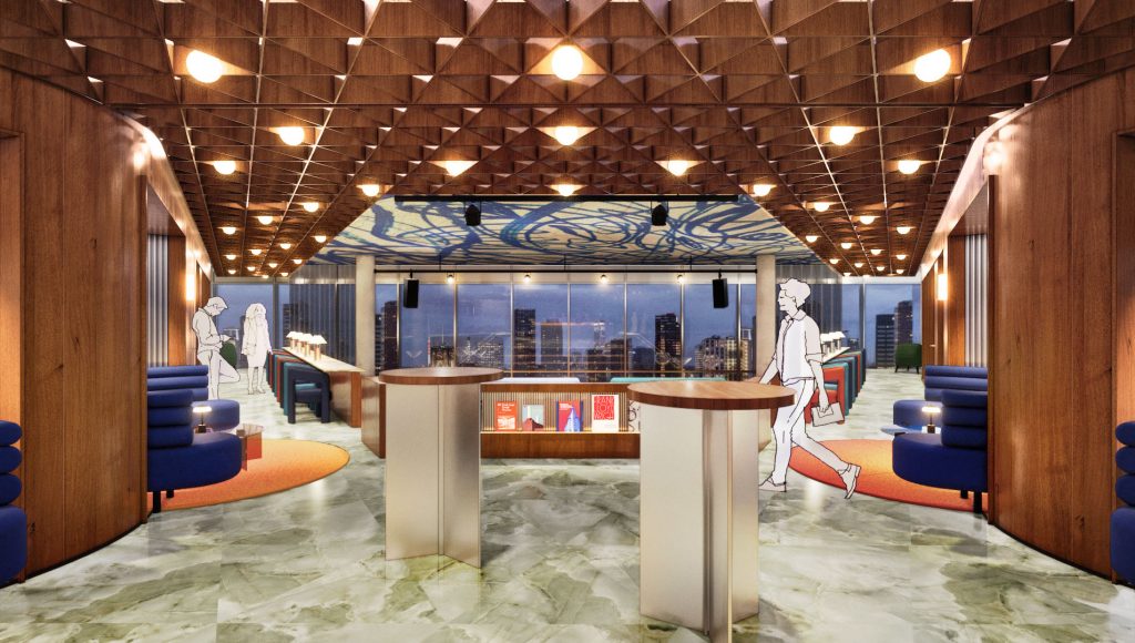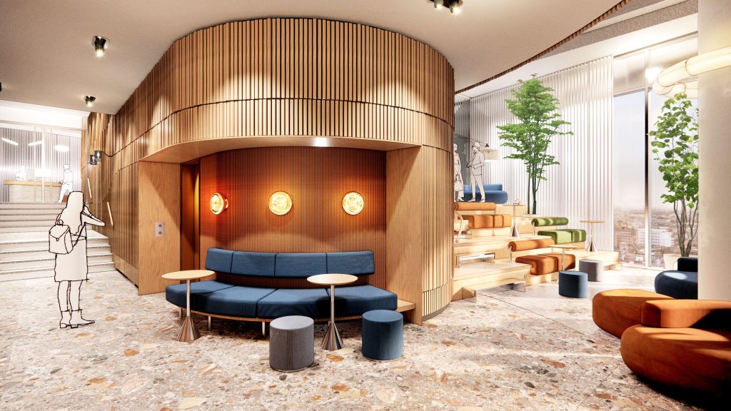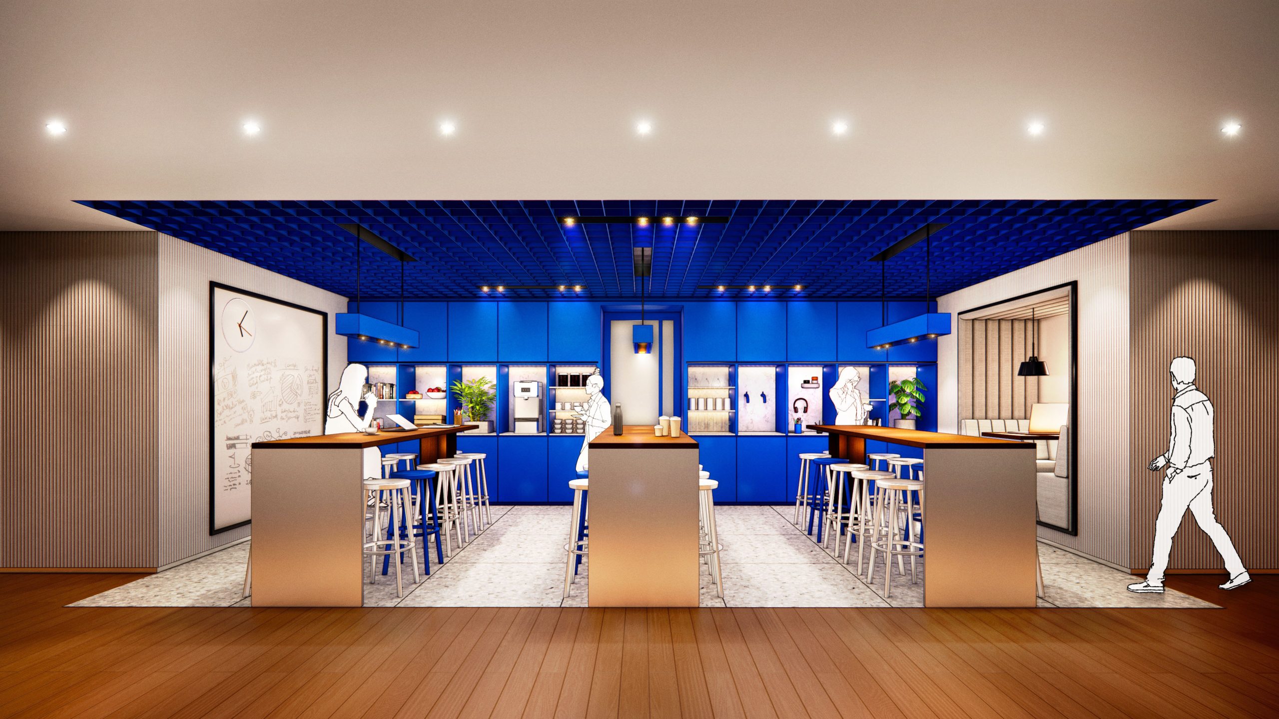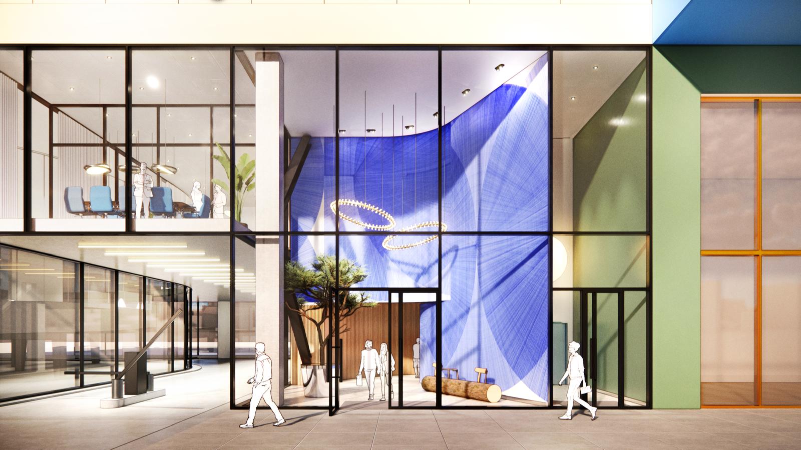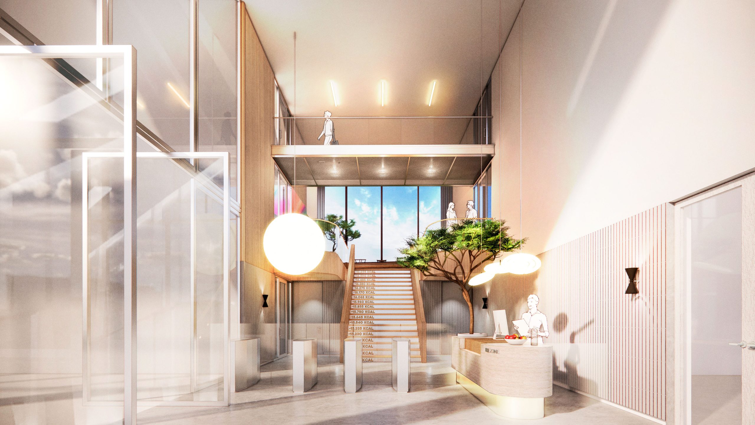 At the heart of the building is the entrance to the Blue Zone offices. A prominently visible entrance leads you inside, followed by a spacious staircase with escalators taking you upwards to the reception and the Work Café. The staircase is surrounded by large multimedia screens that create a visual journey to the Blue Zone, an experience that takes your mind off things and welcomes you into this unique environment.