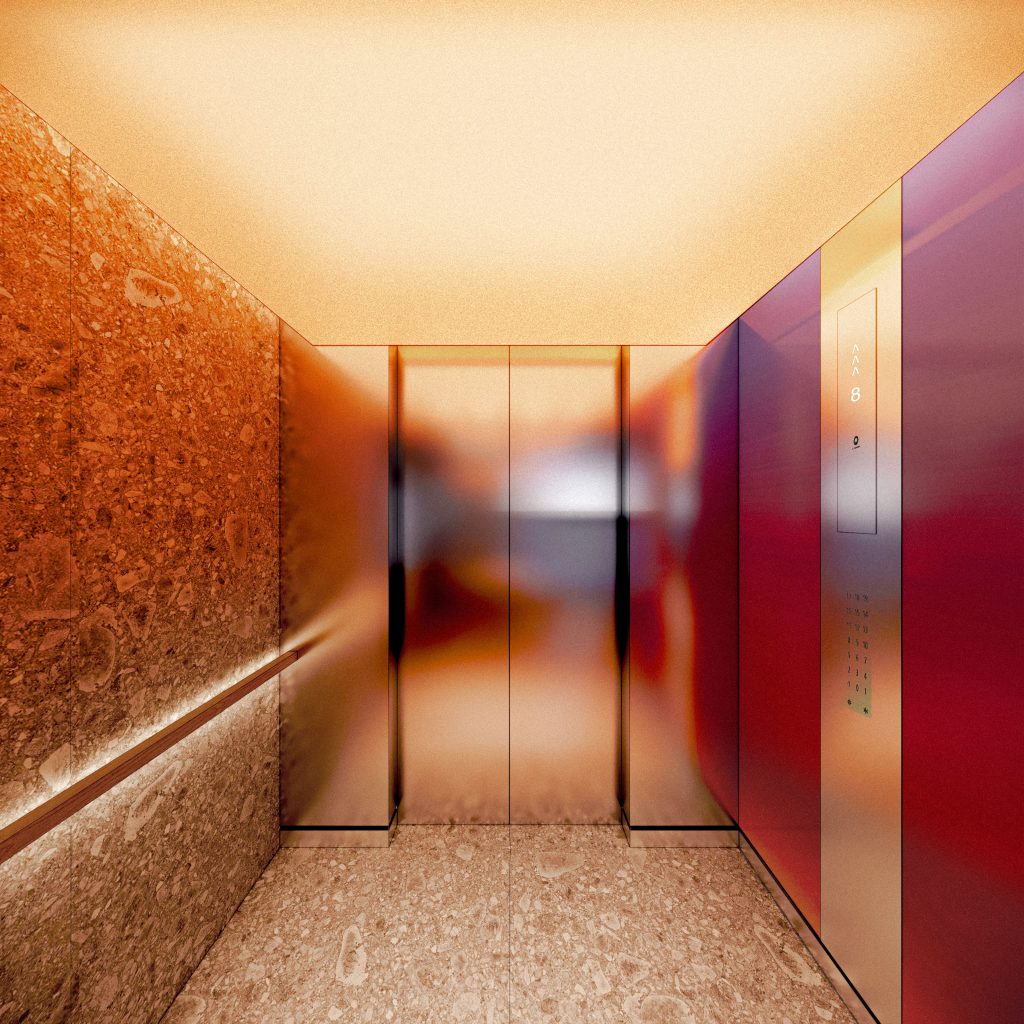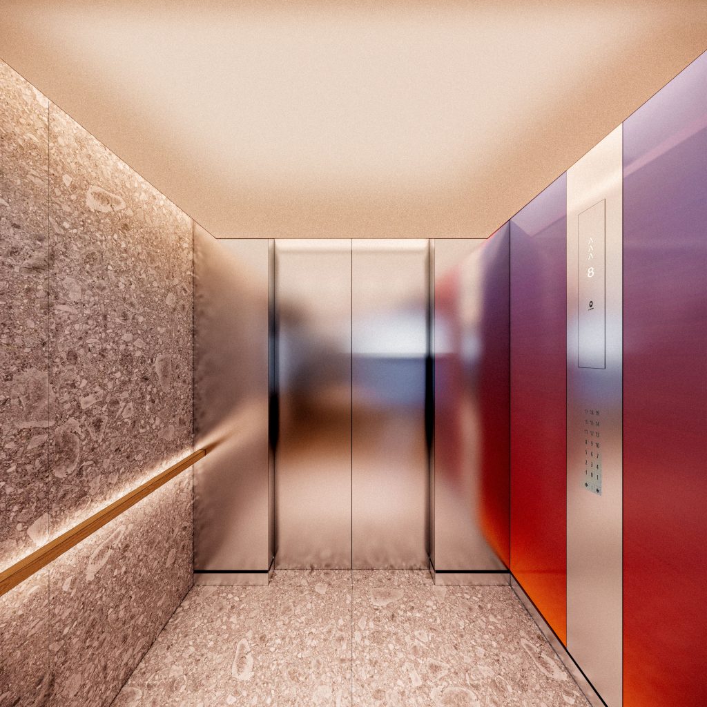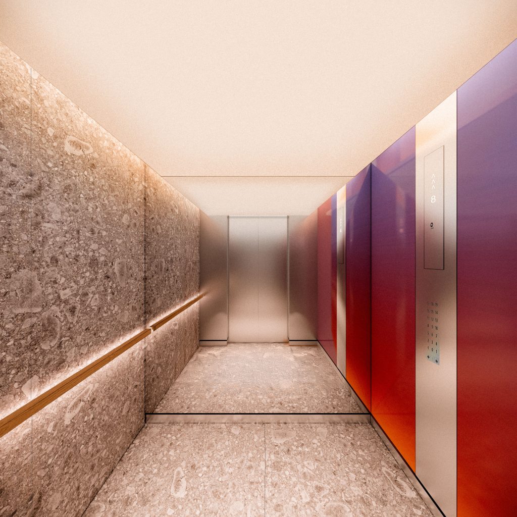 The entrance to the public elevators, which take visitors to the rooftop, is combined with the entrance to the parking garage. A wide staircase with escalators leads from the ground floor to the balcony level, offering a clear view of the many train tracks of Rotterdam Central Station. From this balcony, the elevators depart, giving you access to the public terrace, The Canteen, and, if invited, the Social Club.