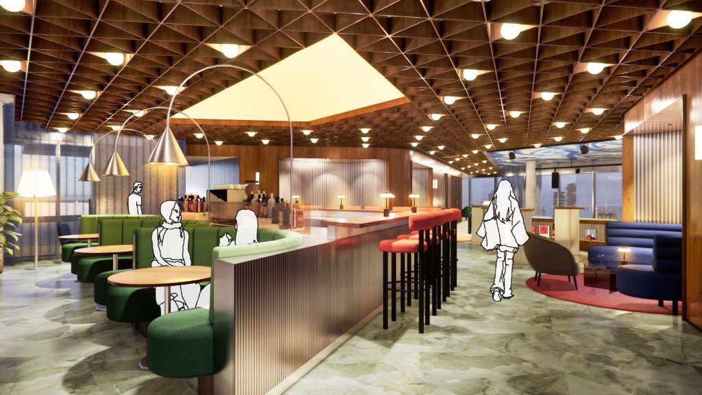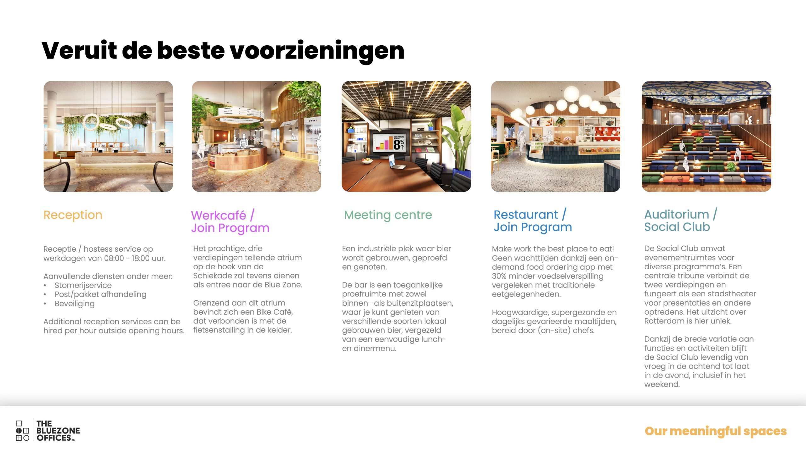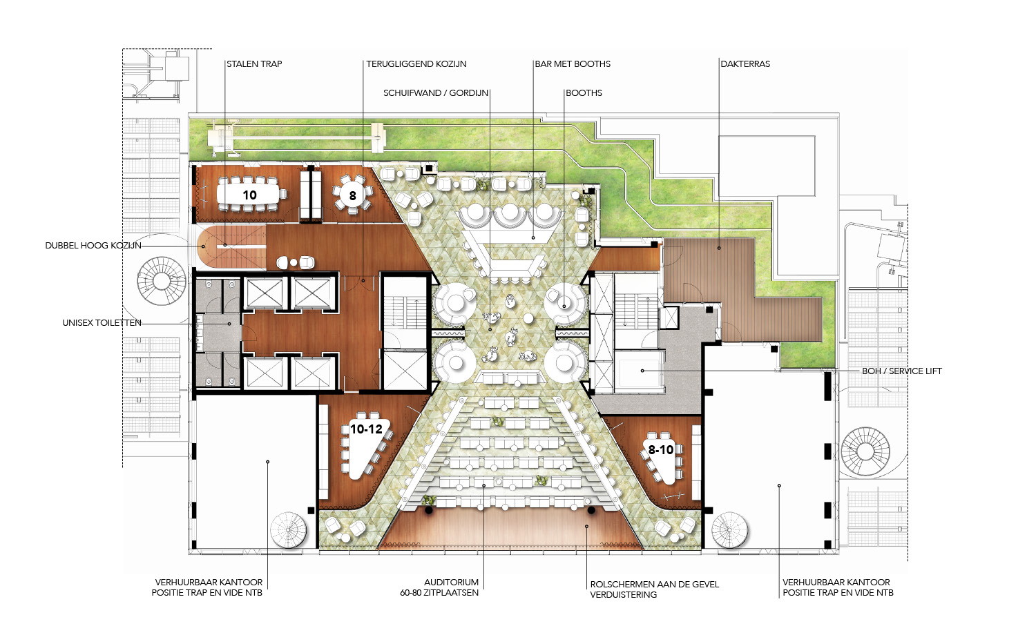 The Social Club includes an intimate restaurant and event spaces for various programs. A central tier connects the two floors, serving as a city theater for presentations and other performances. The view of Rotterdam from here is unique. Visitors to the club have access to the rooftop terrace, which can be used on sunny days. During office hours, the Social Club is accessible via the general elevators; outside office hours, the panoramic elevators provide access. Thanks to its wide variety of functions and activities, the Social Club remains lively from early morning until late in the evening, including weekends.