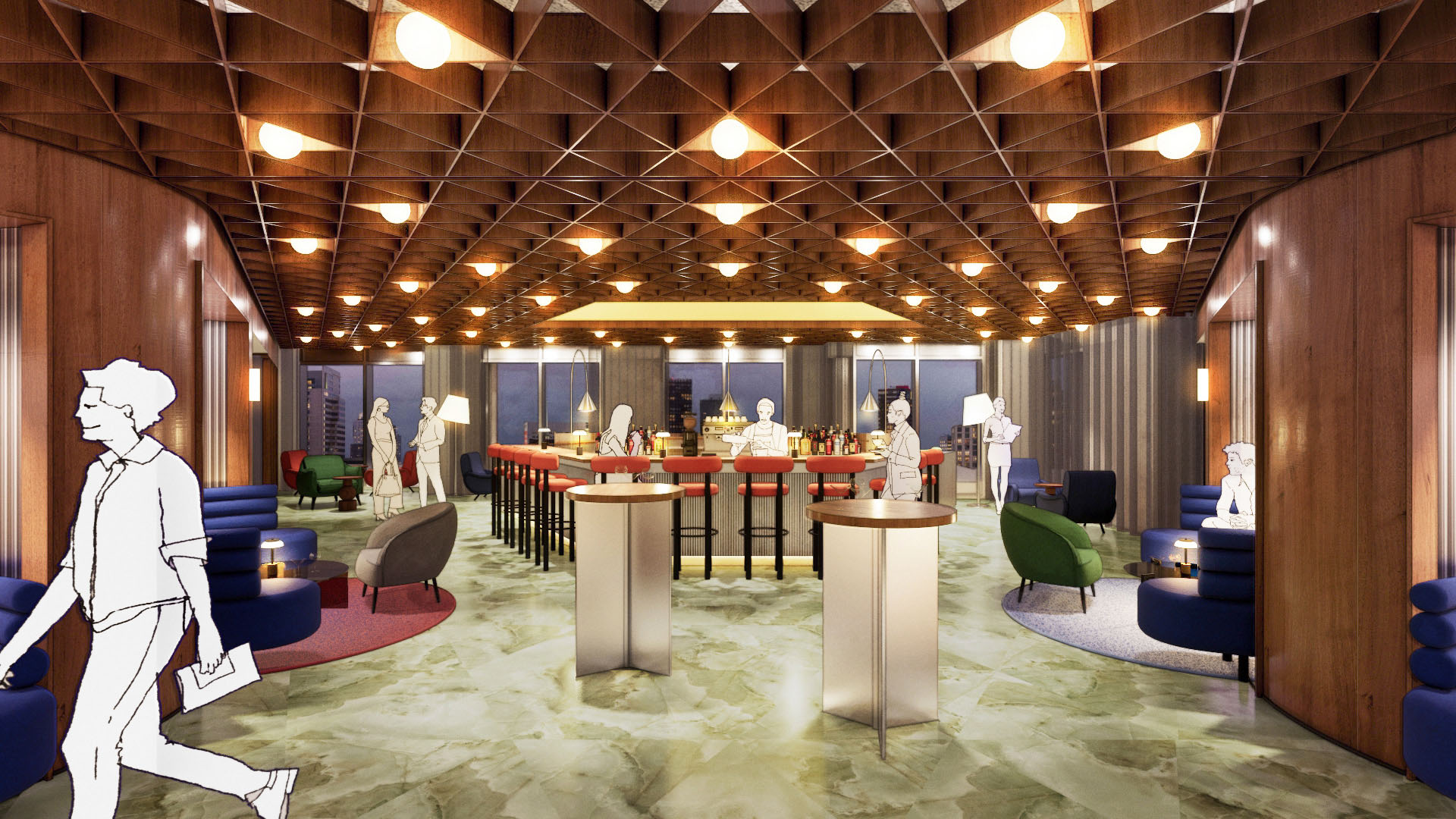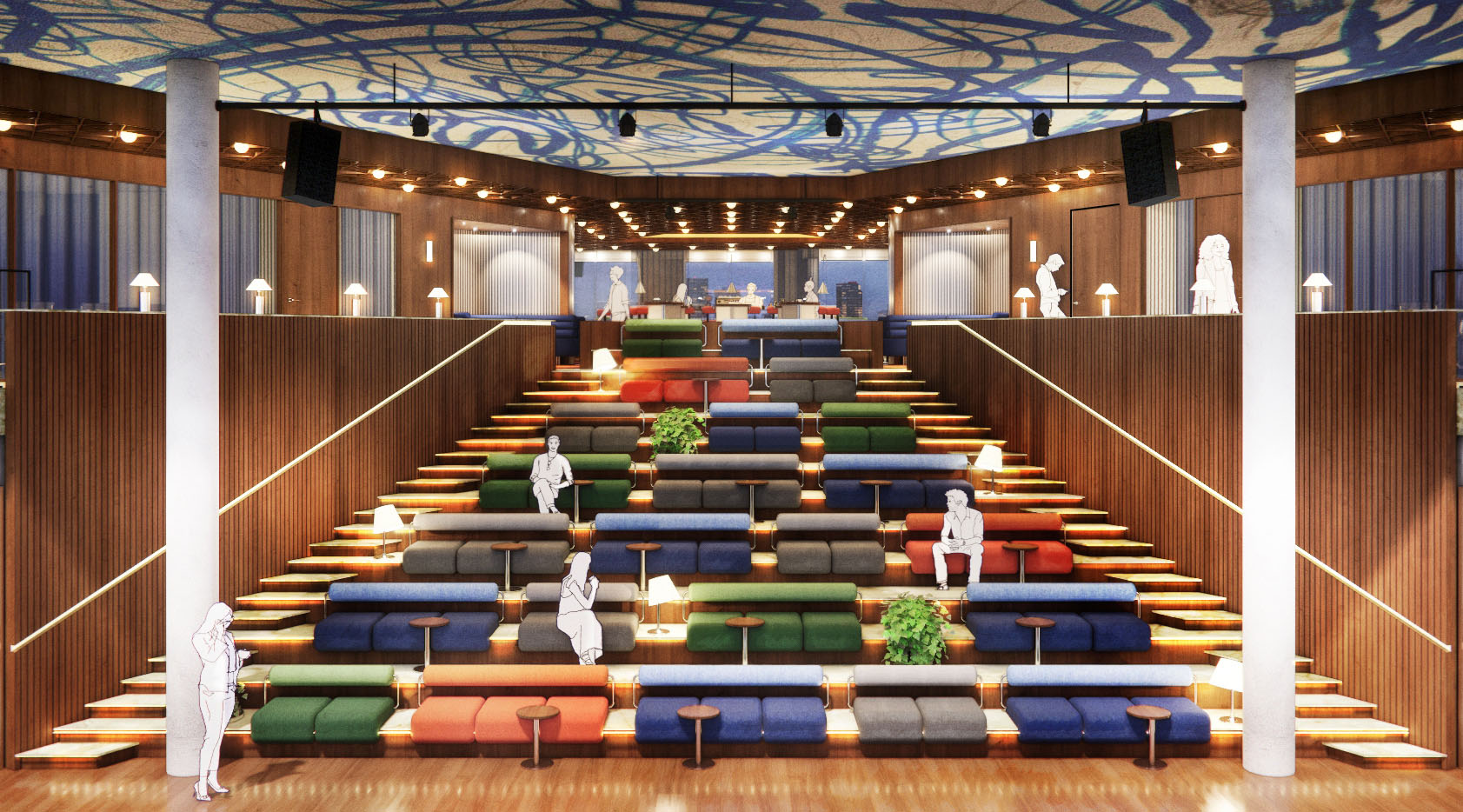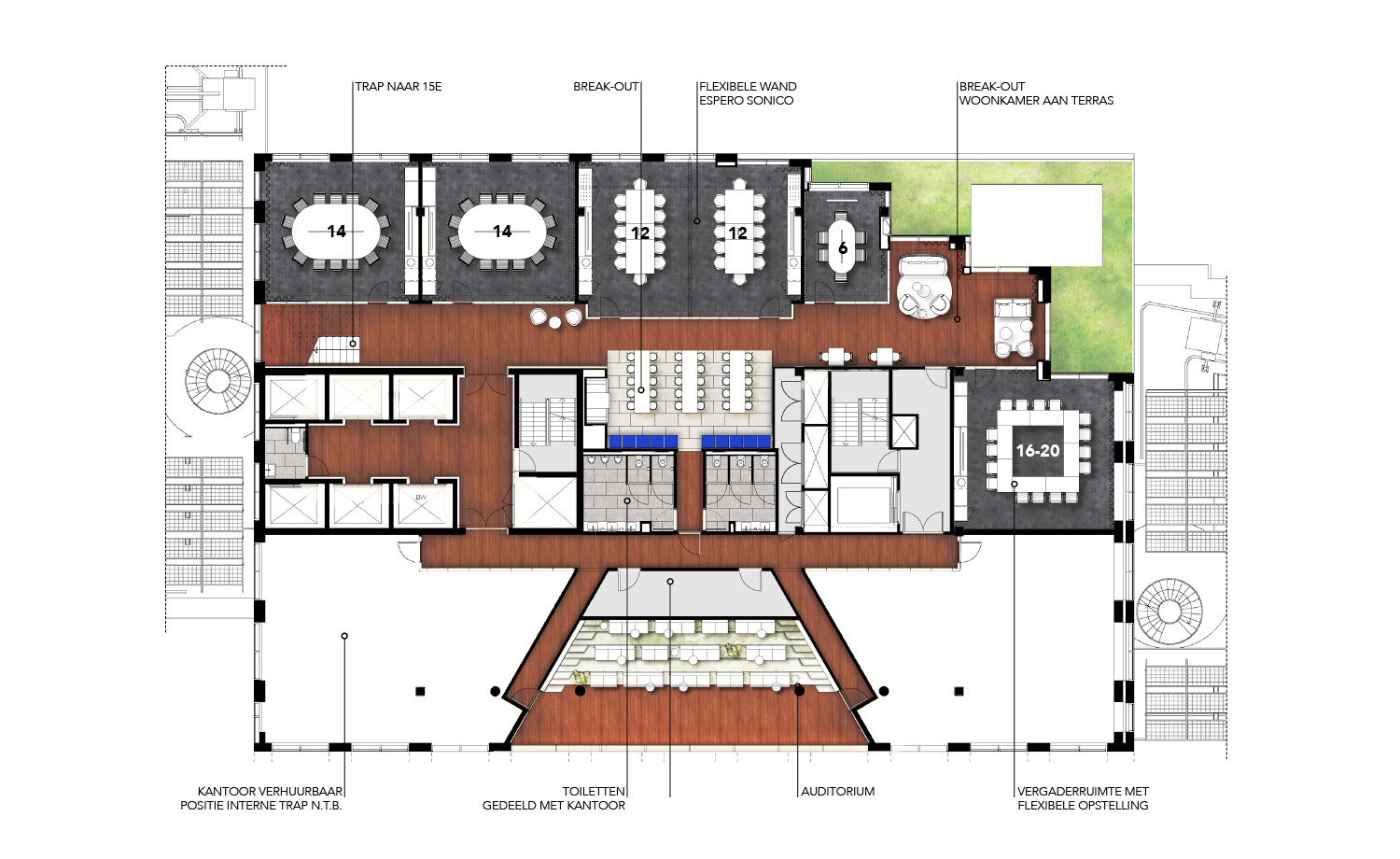 The Social Club includes an intimate restaurant and event spaces for various programs. A central tier connects the two floors, serving as a city theater for presentations and other performances. The view of Rotterdam from here is unique. Visitors to the club have access to the rooftop terrace, which can be used on sunny days. During office hours, the Social Club is accessible via the general elevators; outside office hours, the panoramic elevators provide access. Thanks to its wide variety of functions and activities, the Social Club remains lively from early morning until late in the evening, including weekends.