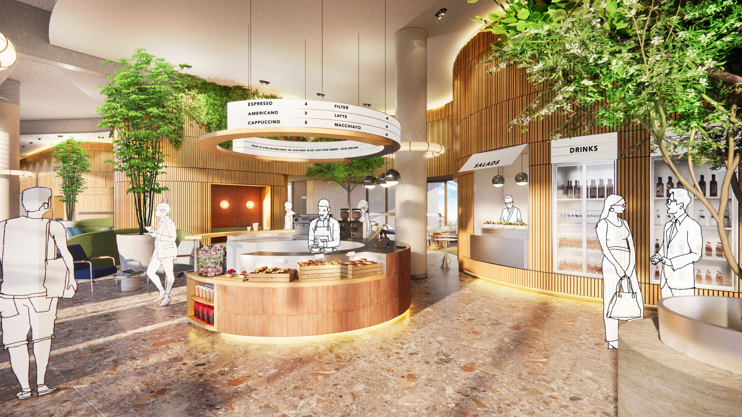 The building's highest volume houses The Canteen, which is connected to both rooftop gardens. It’s not a traditional communal restaurant but a modern concept with an open kitchen at its center. Here, fresh meals are prepared daily with ingredients sourced from the Rotterdam area. From the kitchen, you walk into the spacious dining room, offering a panoramic view of the city. The Canteen also has direct access to both rooftop terraces, so you can enjoy your meal outside in good weather. It’s the perfect place for a healthy, flavorful meal or a snack, designed for breakfast, lunch, dinner, and everything in between.