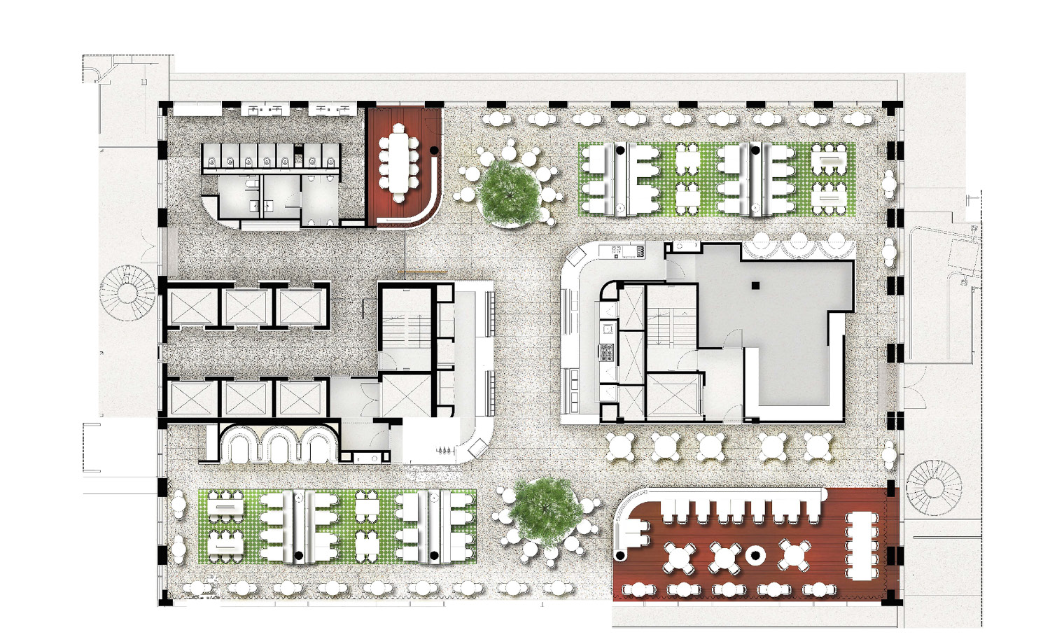 The era of meeting in large, brightly lit rooms with suspended ceilings is long gone. The Social Club is the modern answer to the traditional meeting center and is located on the building’s top two floors. Here, you’ll find formal and informal meeting spaces in a club-like environment: living rooms for relaxing, meeting suites for hosting and break-out sessions, private rooms for confidential discussions, and quiet spaces for concentrating or making calls between appointments.