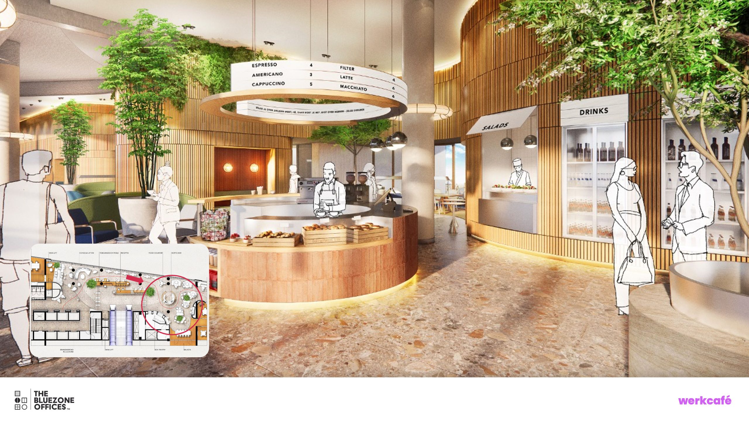 Arguably the most important space within the Blue Zone offices is the Work Café, located directly behind the reception, where users, visitors, the city, and the train station come together. It's a place where you can work informally, make preparations, hold conversations, meet colleagues, and catch up after a day full of meetings. The Work Café is a versatile space that can flexibly adapt to the users’ needs throughout the day. It's also referred to as the "third space": a place to work and spend time between your home and regular workplace. The Work Café also has several meeting rooms and quiet areas, allowing for more formal meetings to take place as well.